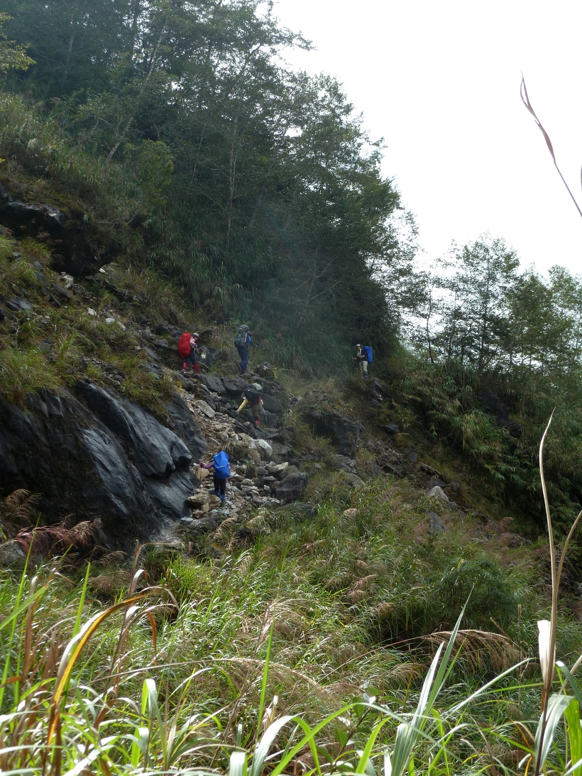 10/26(五): 0400花蓮→萬榮→0800萬榮林道35K→1130阿道別墅42K(午餐)→1330九族山莊46K→1400情人吊橋→1630天梯頂→1700高登工作站(宿)…..步行時程約8.5 hrs。
