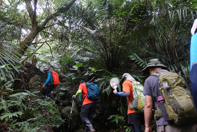 從溪邊開始一路陡上,上升約200公尺,有三段急陡上坡,這裡大多是沙礫地及小土石,沒有抓點的地方很滑腳,感謝陳基裕大哥沿途架了很多粗繩確保。