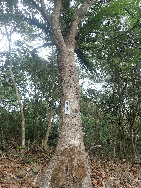 13:13 過雨量計不久,經過大樹綁著護貝的牌子寫:三腳南山山系.雄峰 1032m(無基點)
